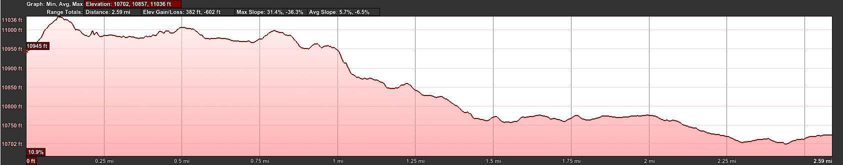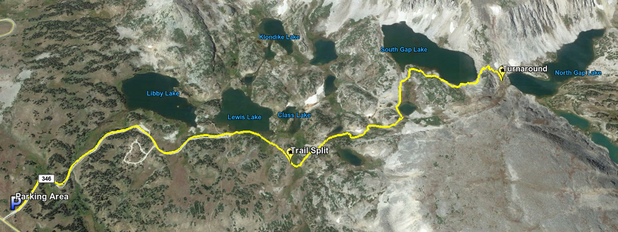 In the above general route outline, the yellow was roughly the route. The trail is clearly defined. The elevation profile provided depicts the return trip from the turnaround point (North Gap Lake) back to the parking area.