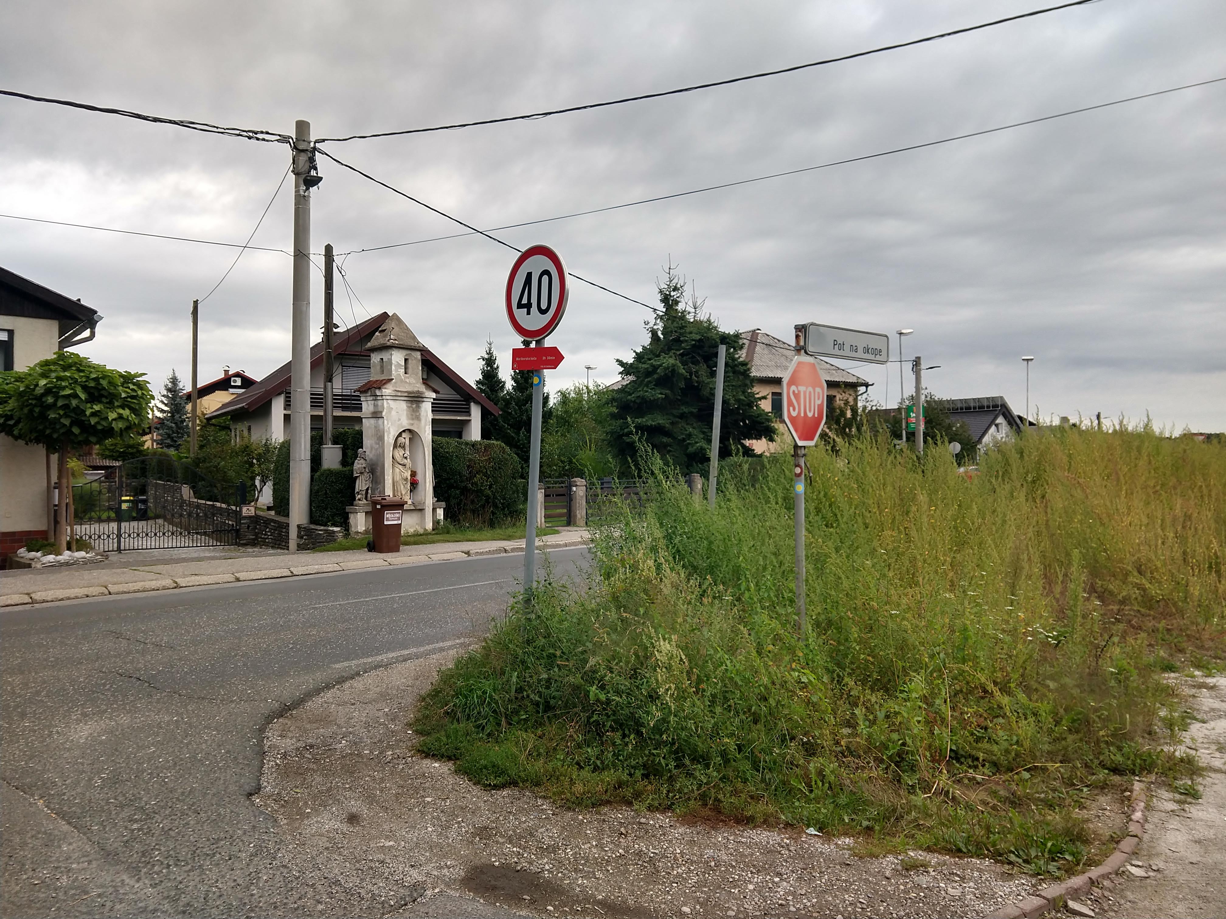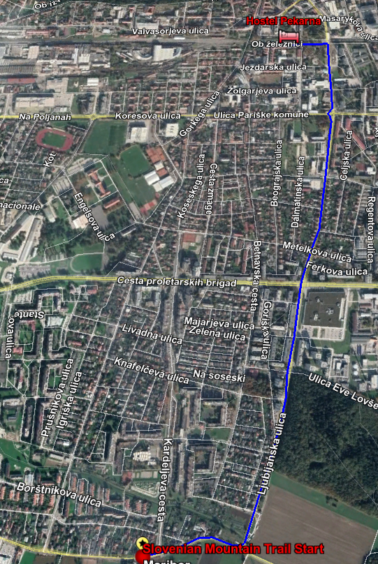 After changing over and grabbing my gear, I went to check-out and left the Hostel by 10AM. To get to the starting point of the Slovenian Mountain Trail, I headed east toward Ljubljanska ulica (street) and walked on the sidewalk south until the road T’s into Streliška Cesta (road). Hang a right (west) along the Cesta for about 0.25 miles (0.41KM) until you get to Pot na Okope. The map below depicts the route i walked in blue.