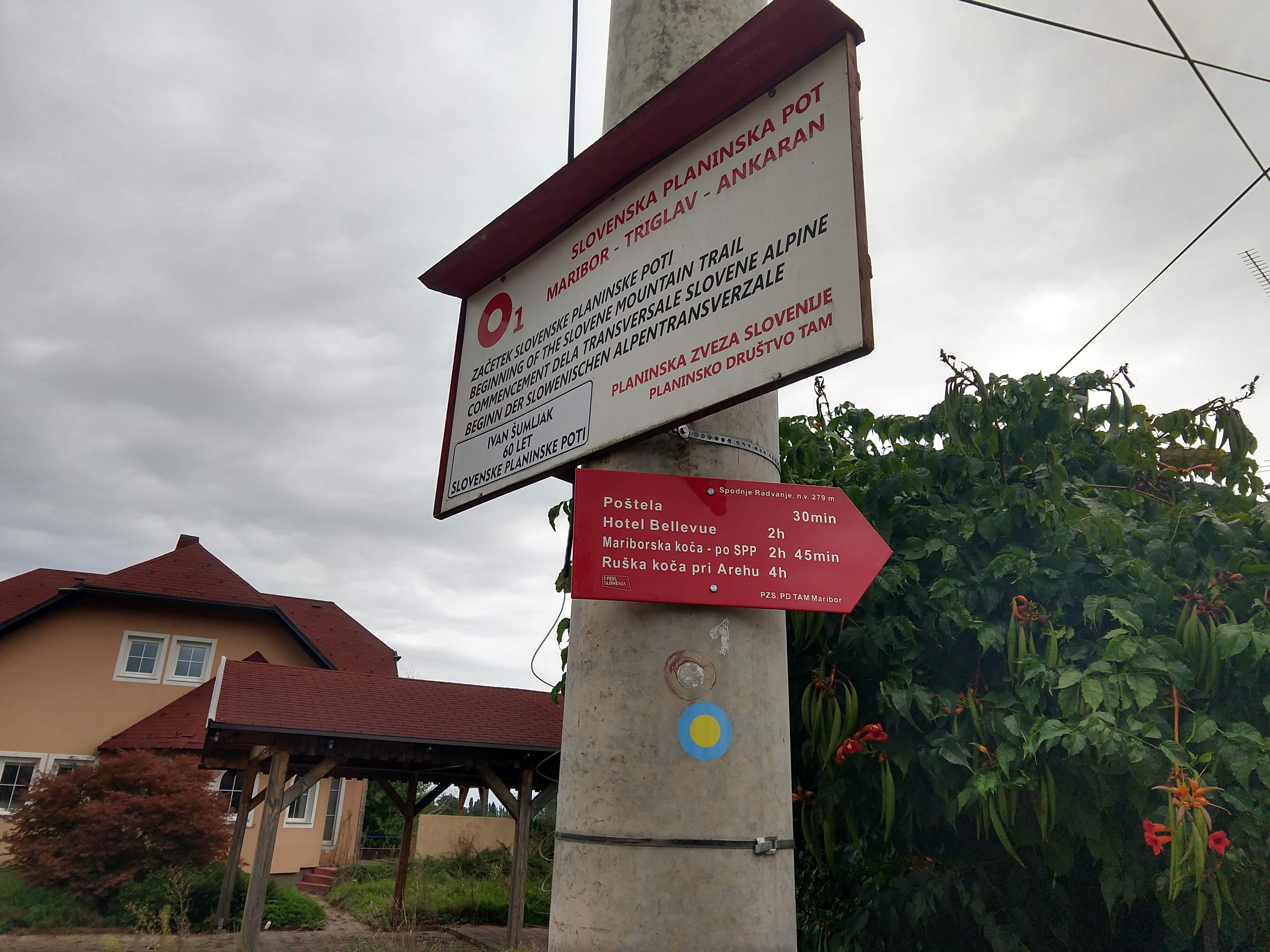 The White dot with Red circle around it is the Knafelc blazes. The Knafelc blaze with subscript of 1 is the marker you will follow the entire way if you are hiking the Slovenian Mountain Trail (SMT), or Slovenska Planinska Pot in Slovene. The 1 signifies the trail number and primary route of the transversal. The SMT was also the first transversal hiking trail in Europe. It was also originally named the Slovenian Mountain Tranversal from 1953-1991.