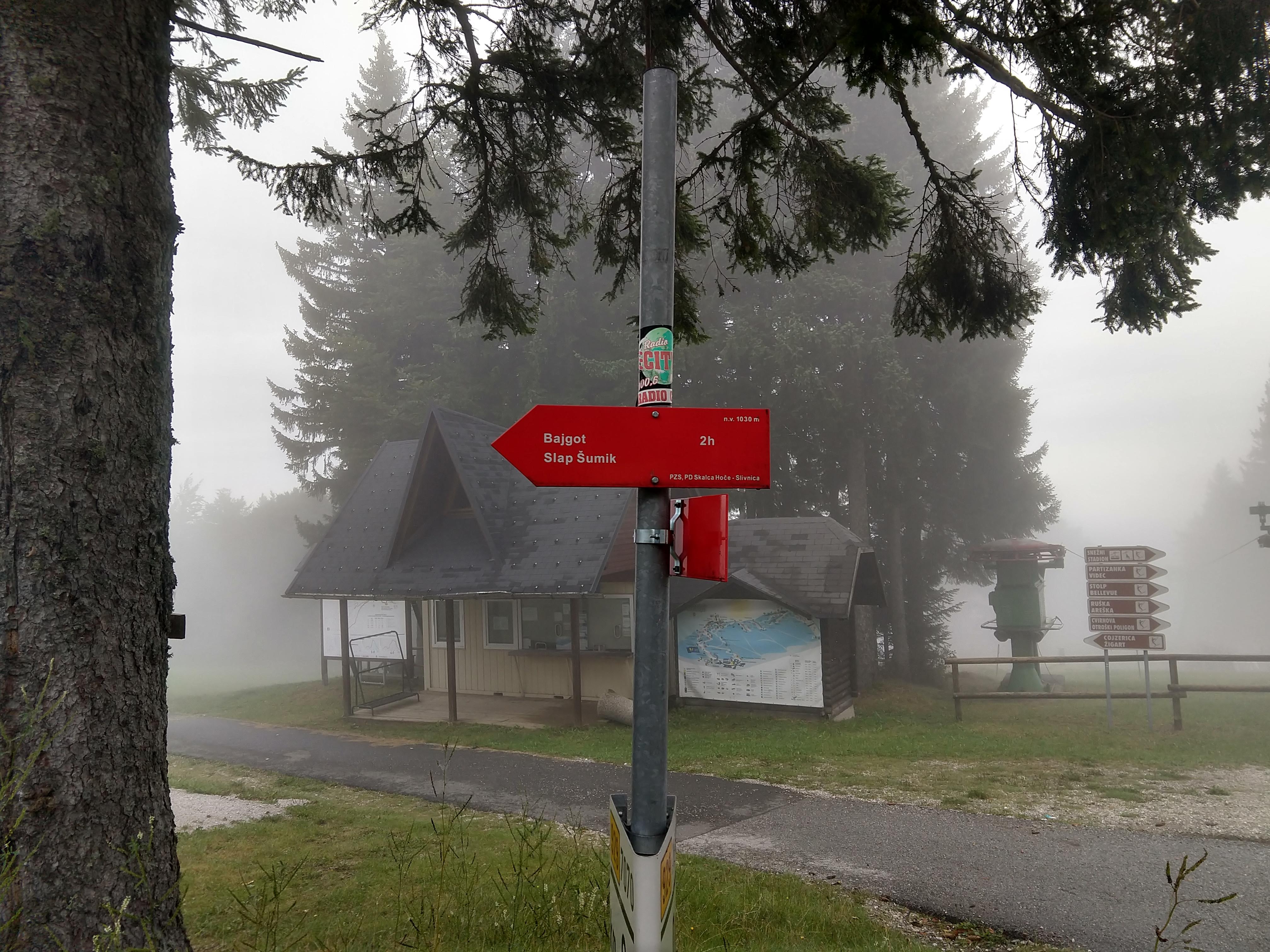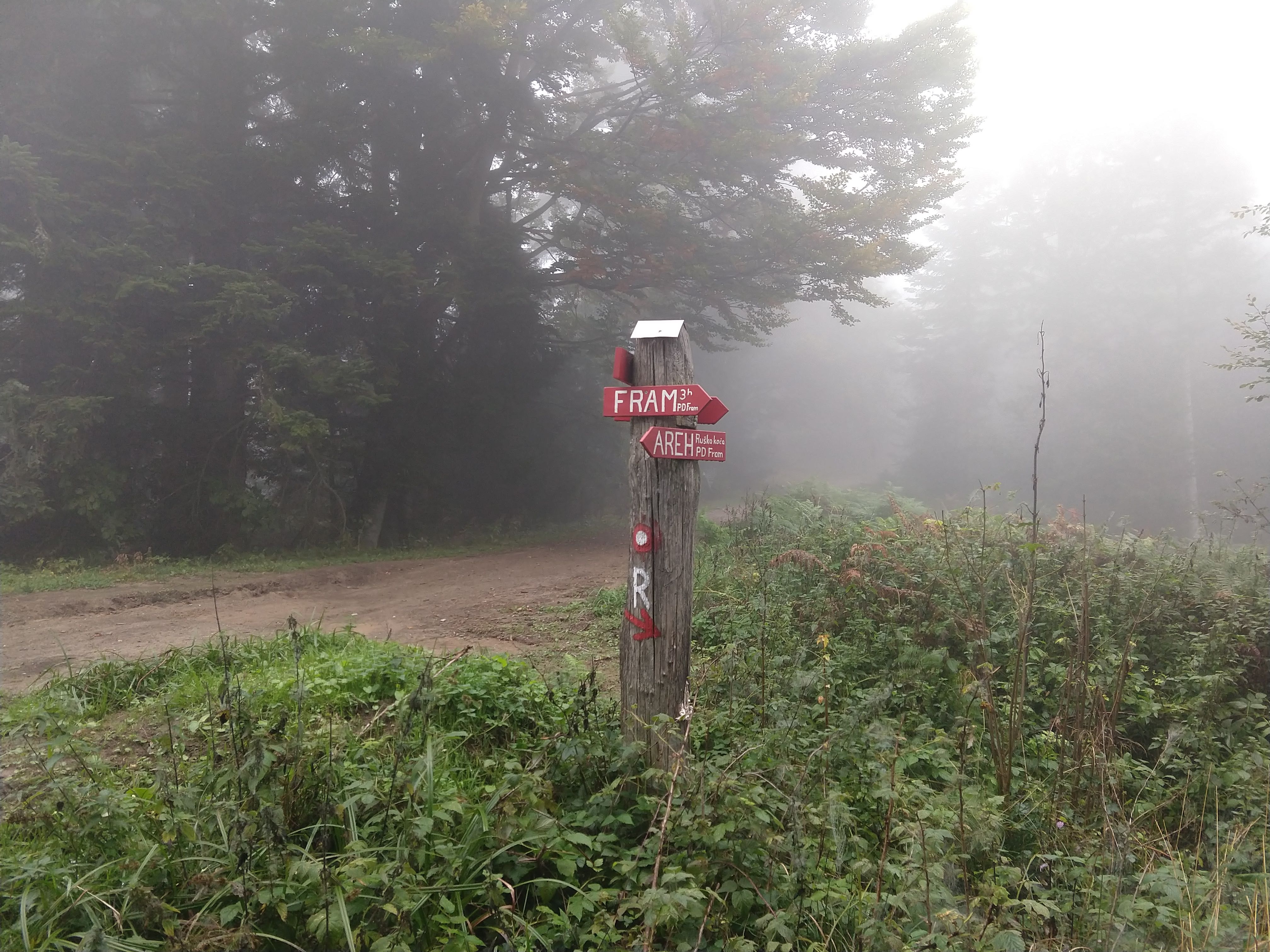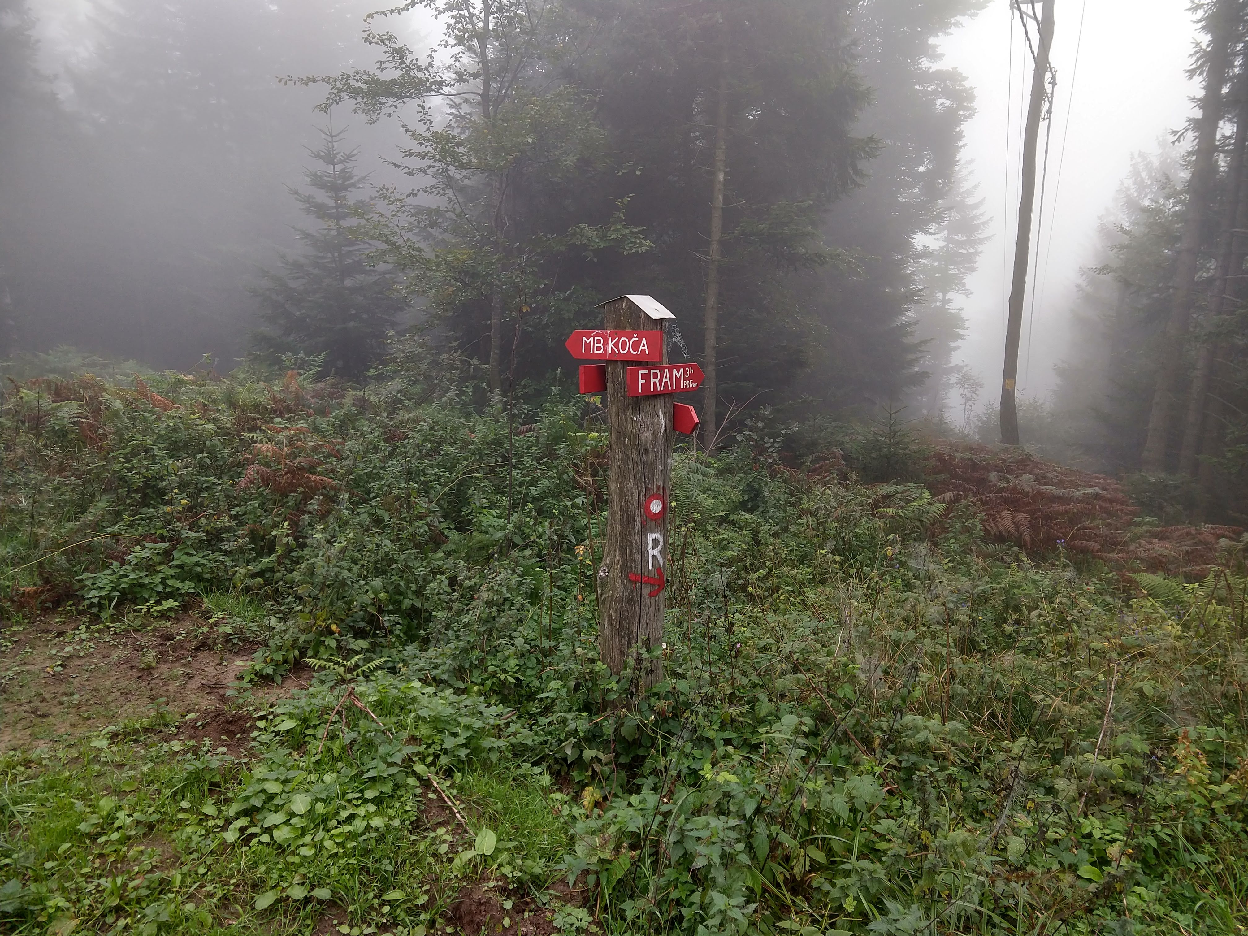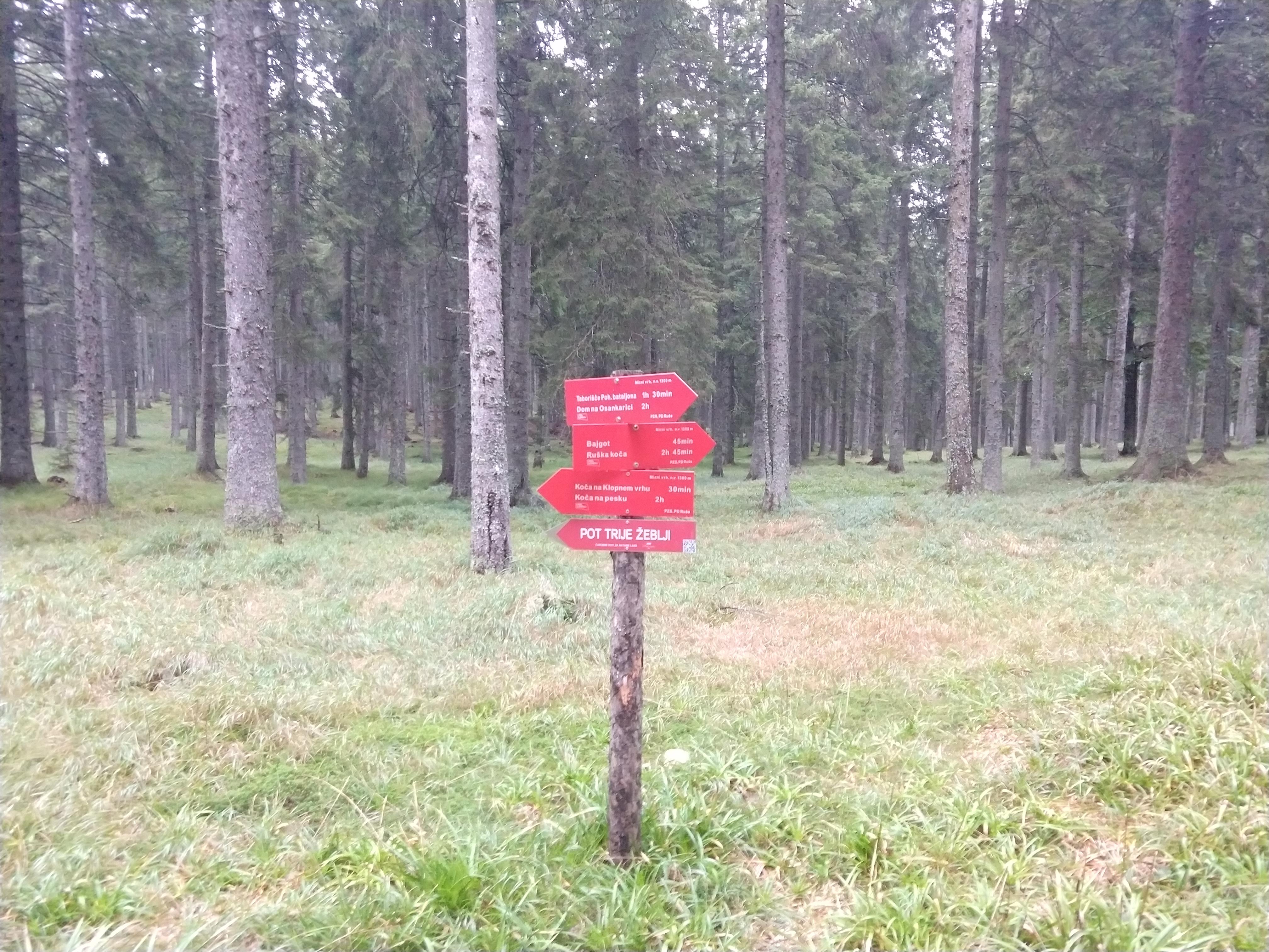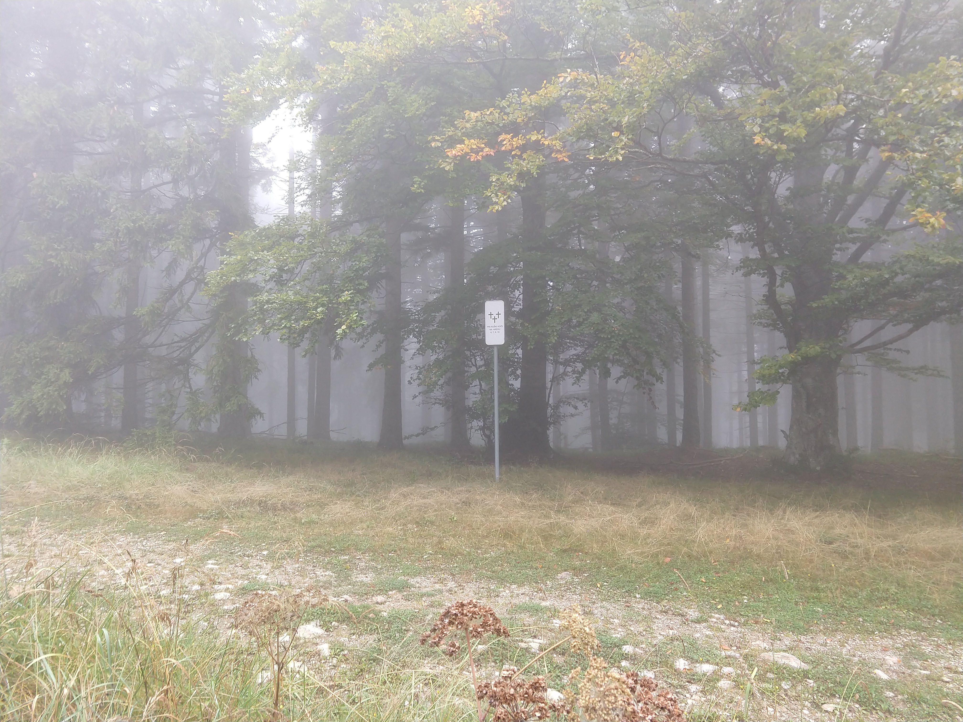 My next destination was Ruška Koča pri Arehu, which the sign indicated would take about an hour or so. The photo gallery below depicts the views and scenery throughout this section. I arrived at the Ruška Koča around 1540. During this section, the visibility drastically changed and become quite foggy but the slight drop in temperature felt good. During this portion I also passed by several mass grave sites and memorials at the burial sites.
